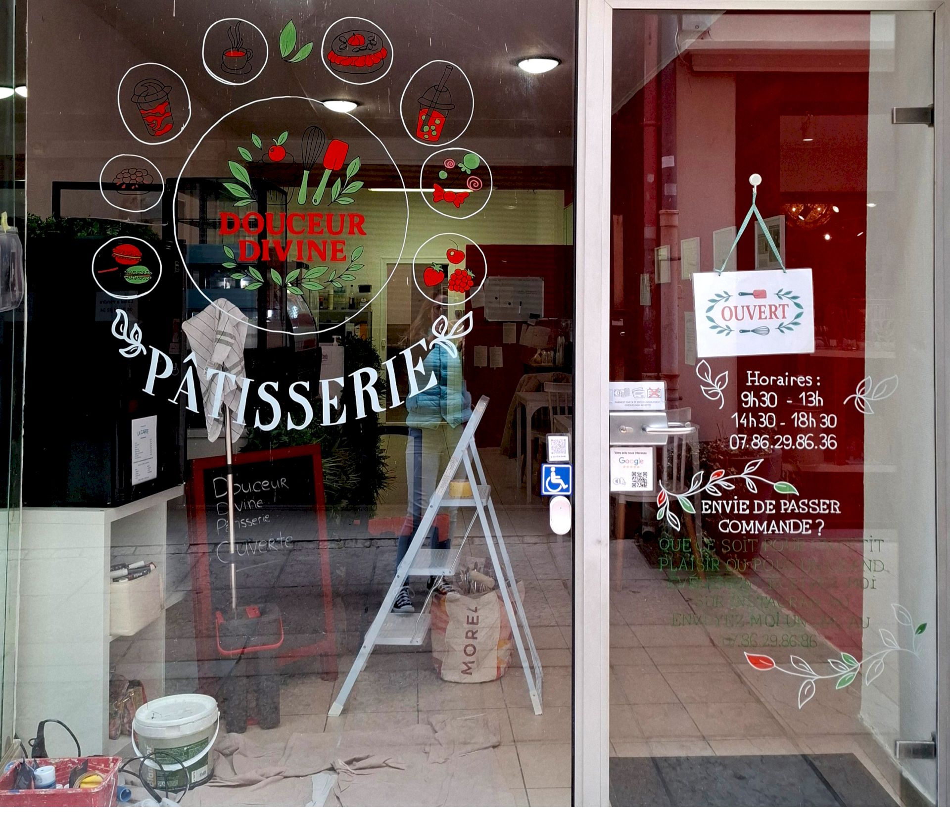 Peinture sur vitrine à Bagnols-sur-Cèze : une vitrine gourmande et artistique