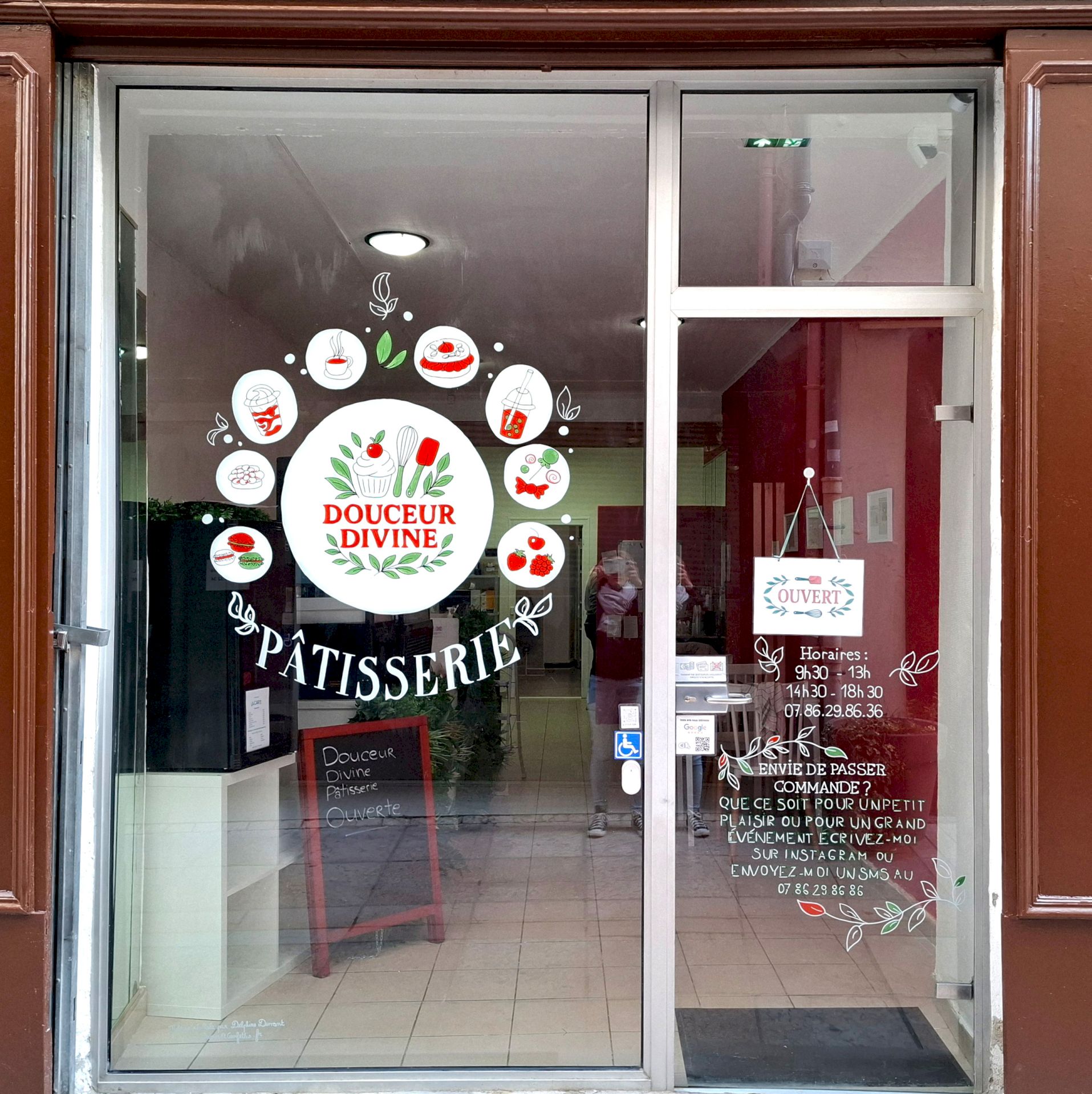 Pour cette vitrine, j’ai dessiné macarons, tartes au citron, Paris-Brest, bonbons et boissons, reproduisant les petites merveilles de la pâtisserie. Chaque motif reprend les couleurs du logo de Douceur Divine, que j’ai également peint sur la vitrine, afin de créer une harmonie entre identité visuelle et décor artistique. L’ensemble forme une composition joyeuse et colorée, où chaque détail a été pensé pour captiver le regard.