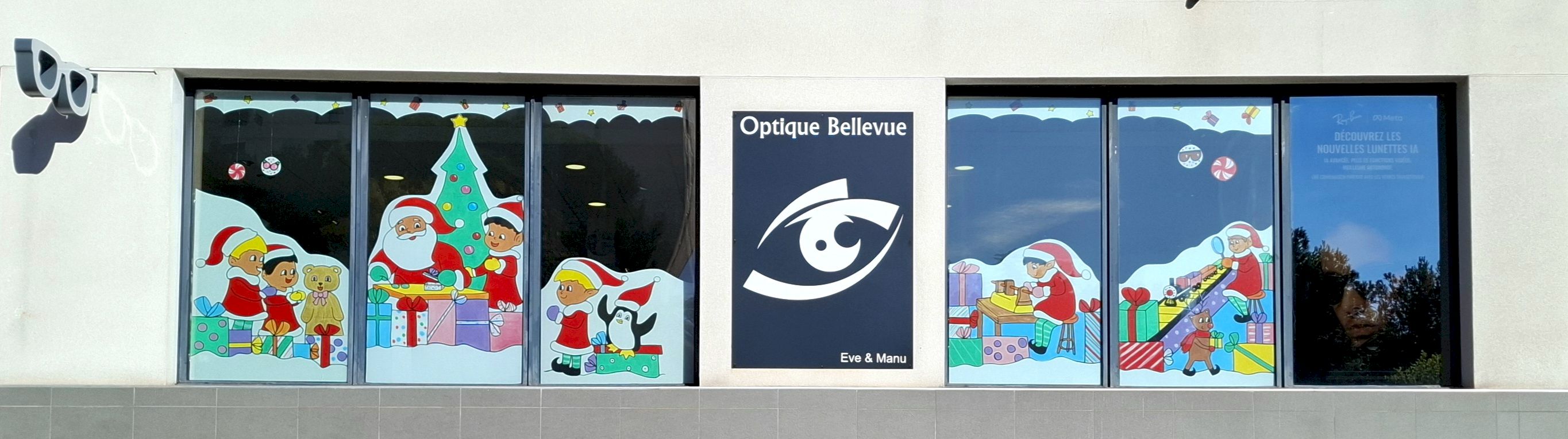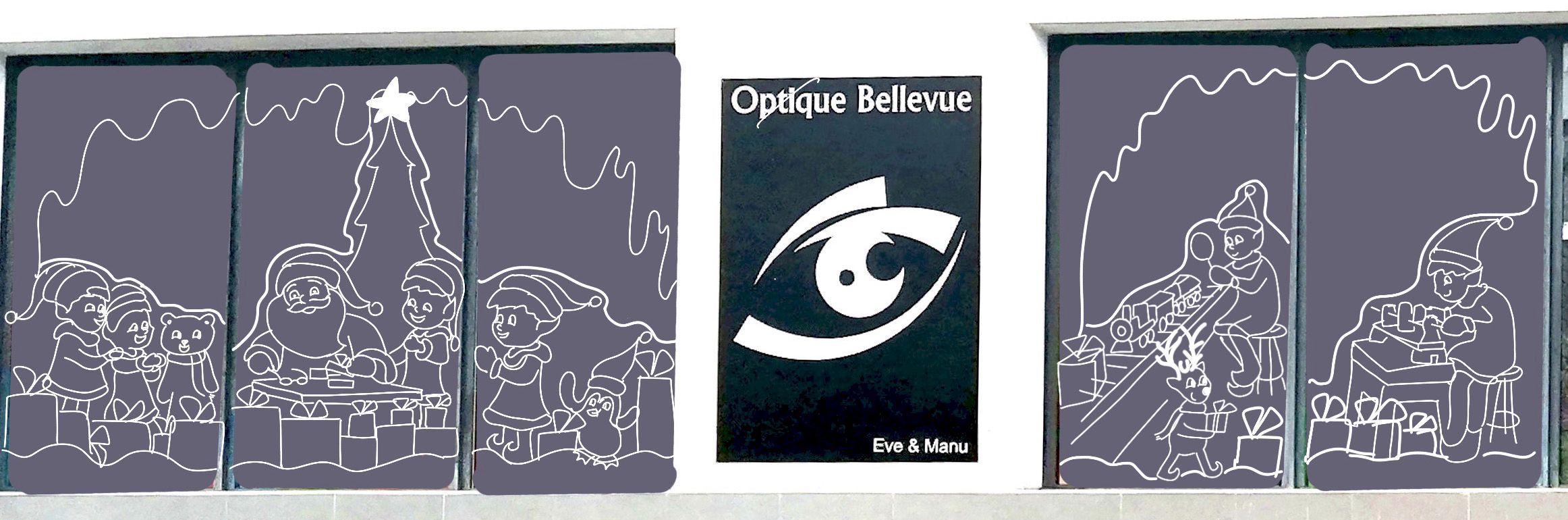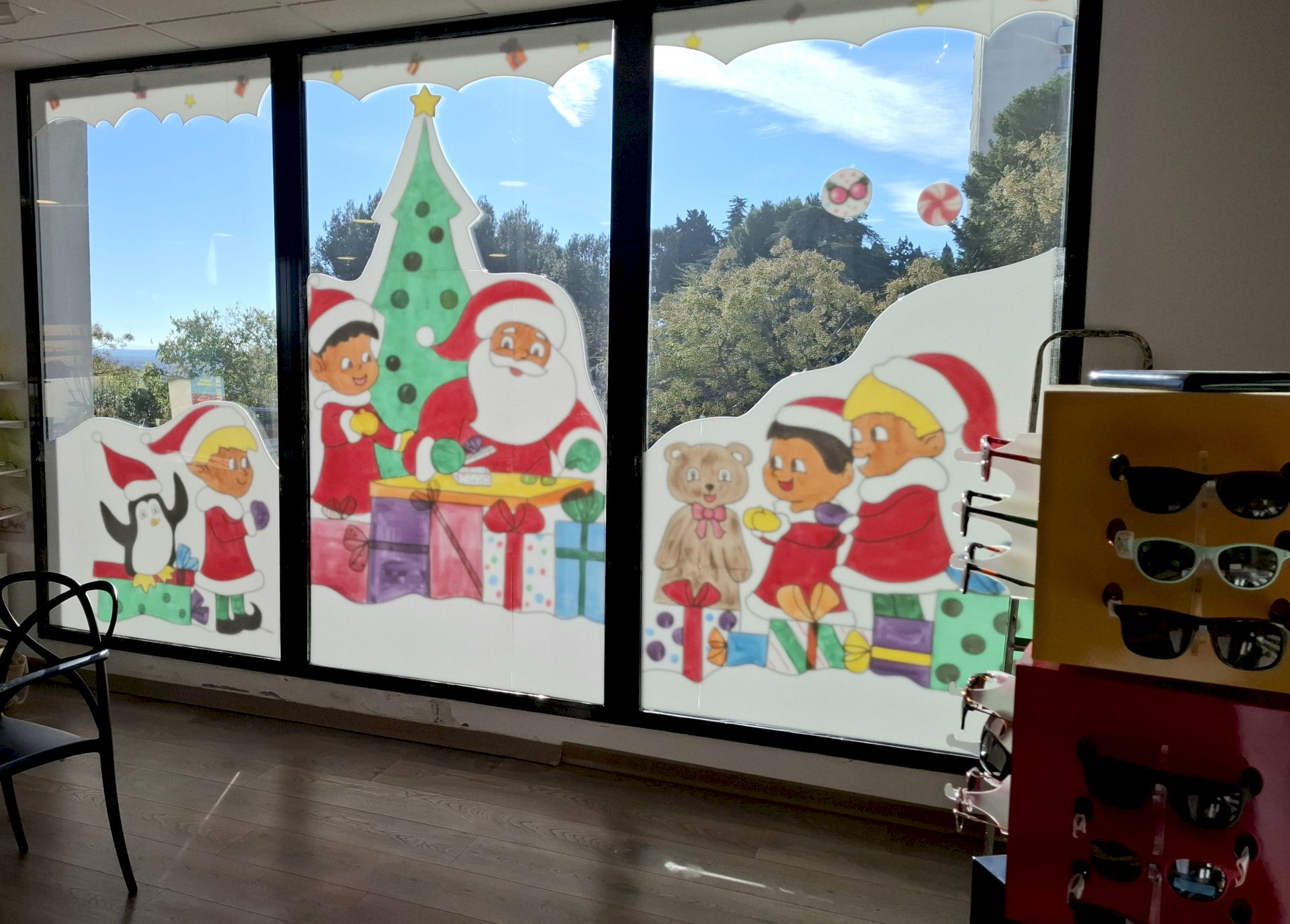 Cette année sur la vitrine d'Optique Bellevue, le Père Noël nous invite dans son atelier parmi ses lutins.
