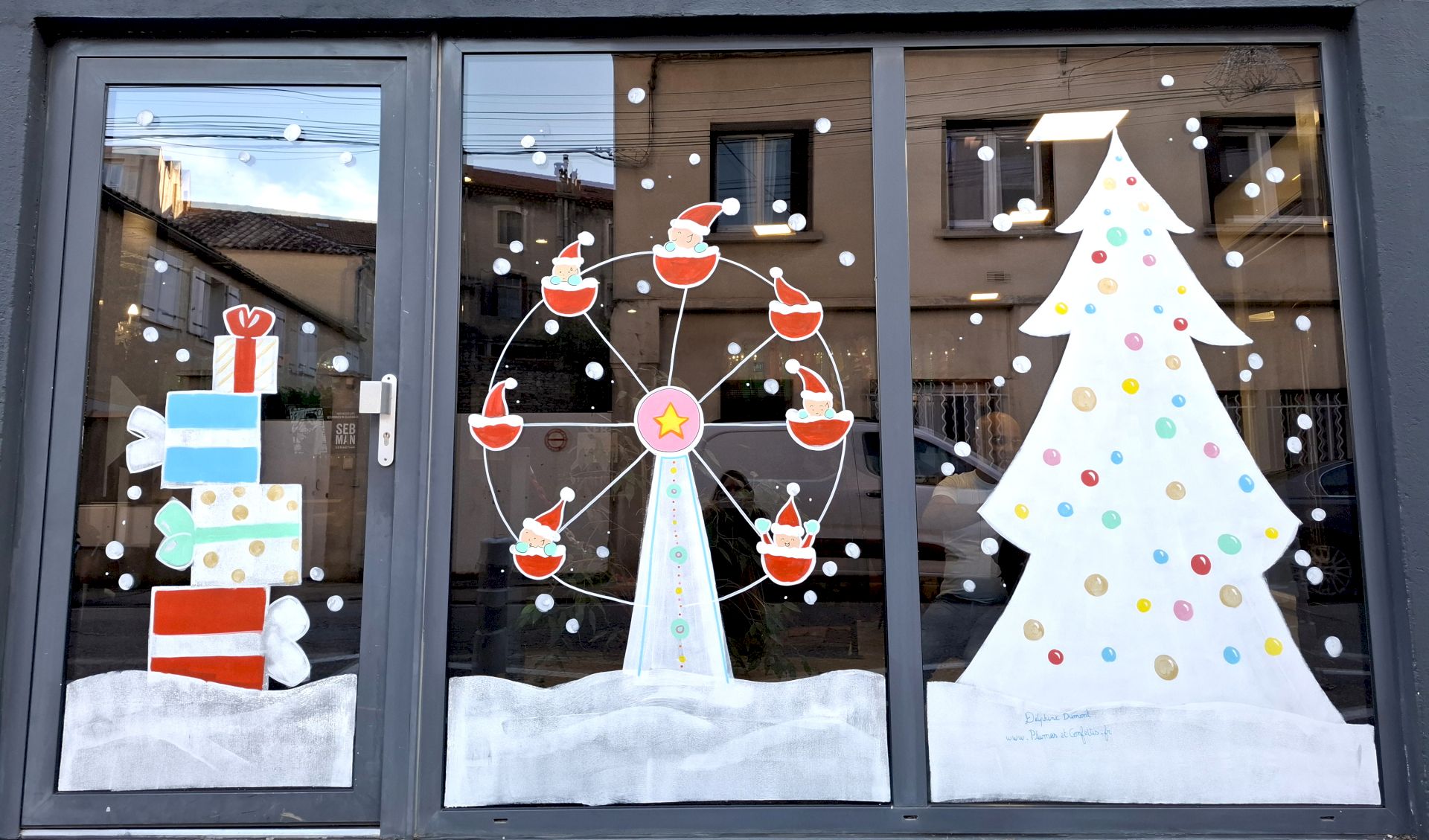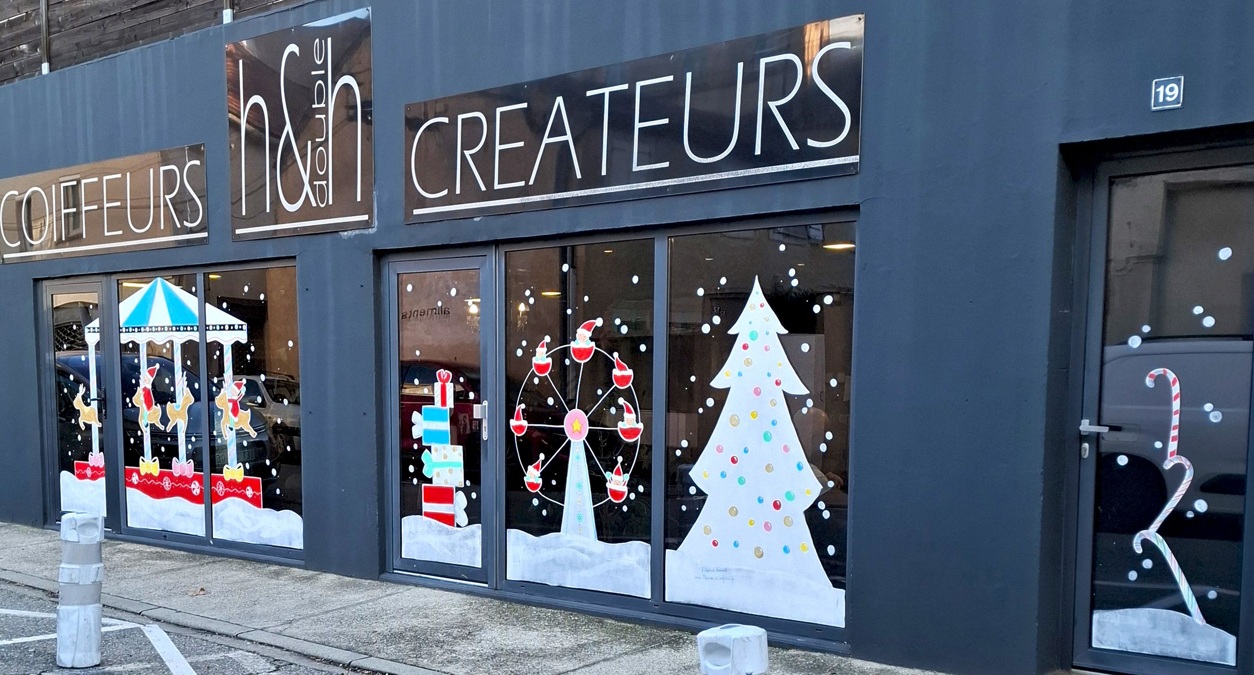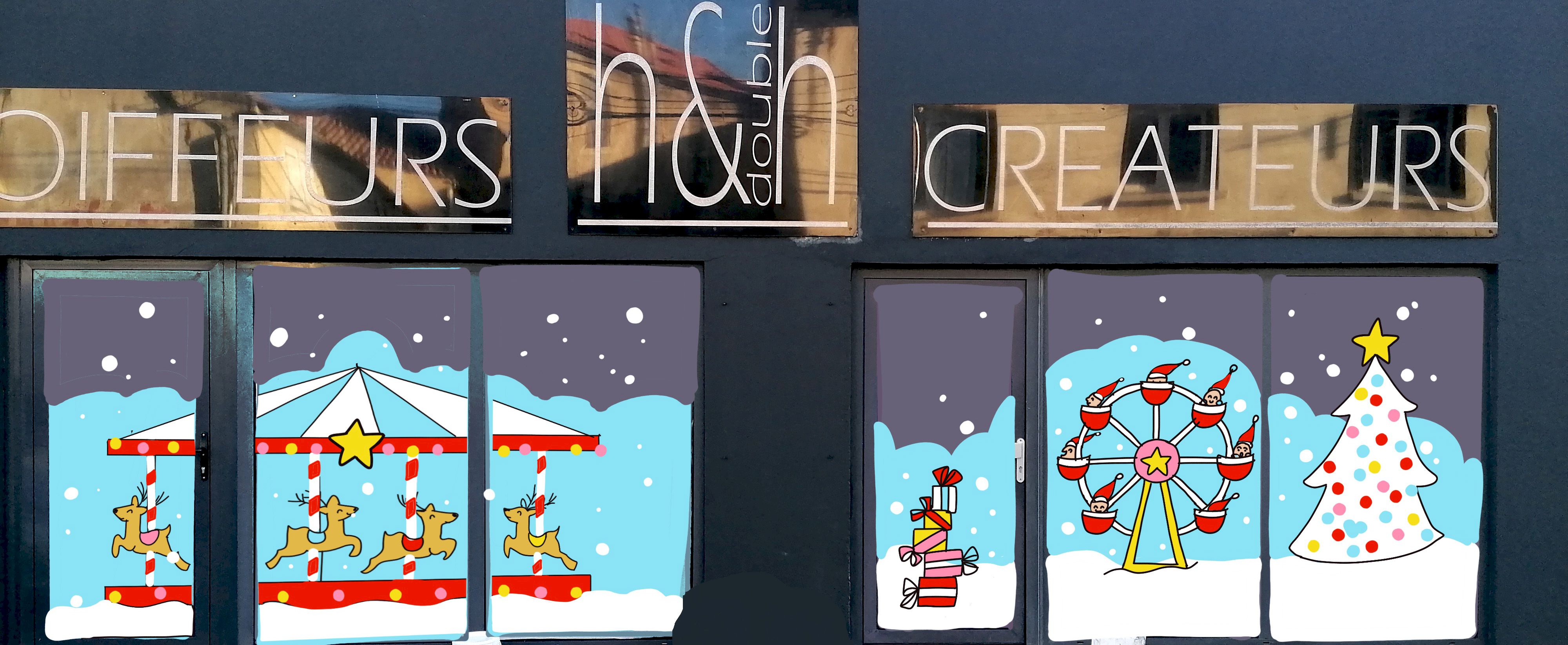 Fresque de Noël sur vitrine pour le salon Double H à Bagnols-sur-Cèze