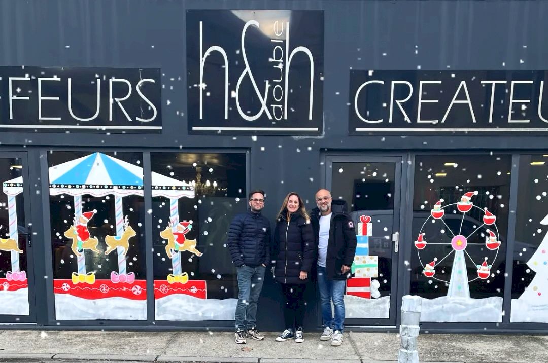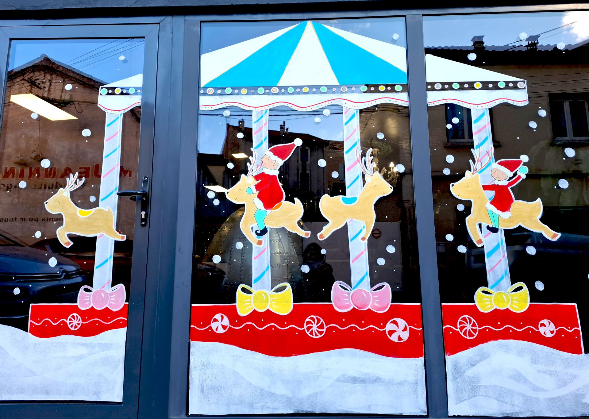 Réaliser cette fresque de Noël a été un moment de création riche et inspirant. Penser les personnages, imaginer les postures des lutins sur leurs rennes ou dans la grande roue, trouver l’équilibre entre dynamisme et douceur… chaque étape a contribué à donner vie à une décoration de vitrine unique, pensée sur mesure pour le salon Double H.