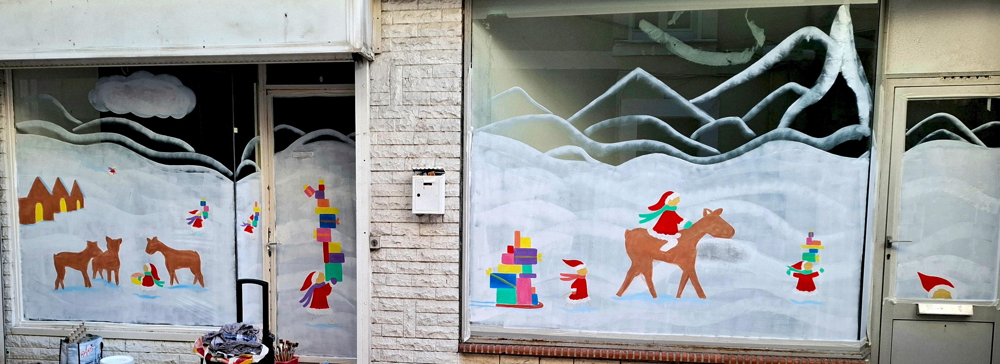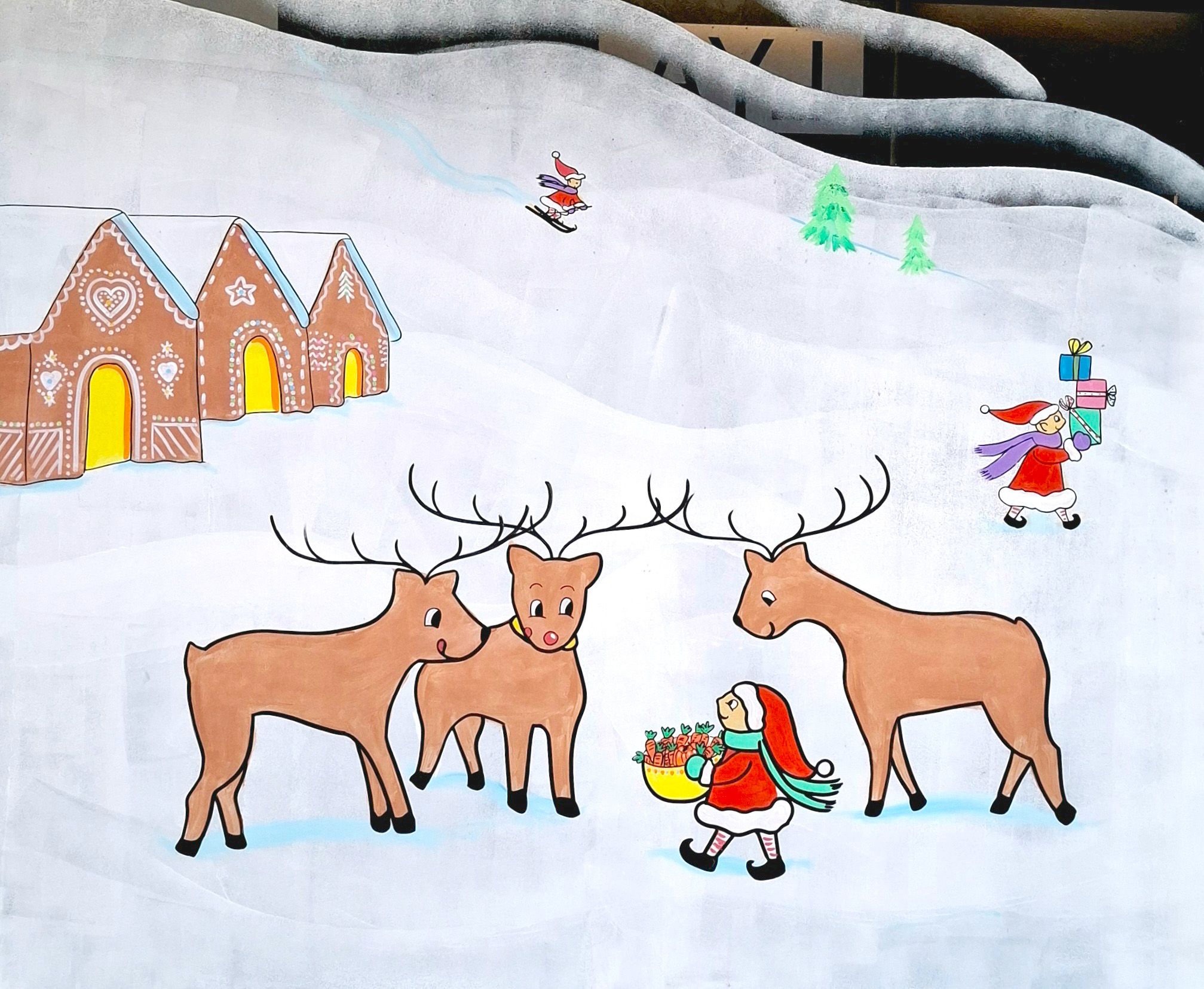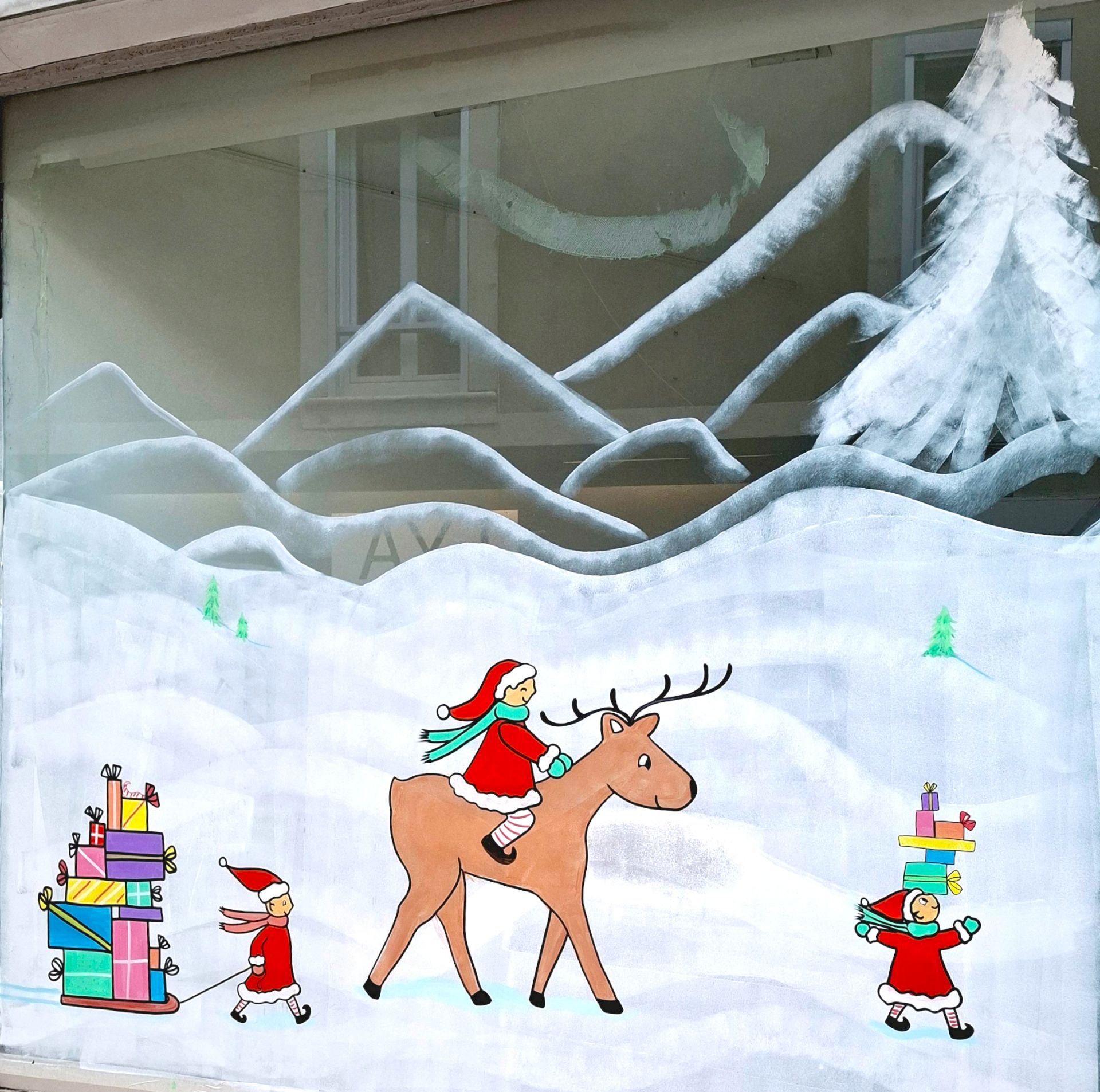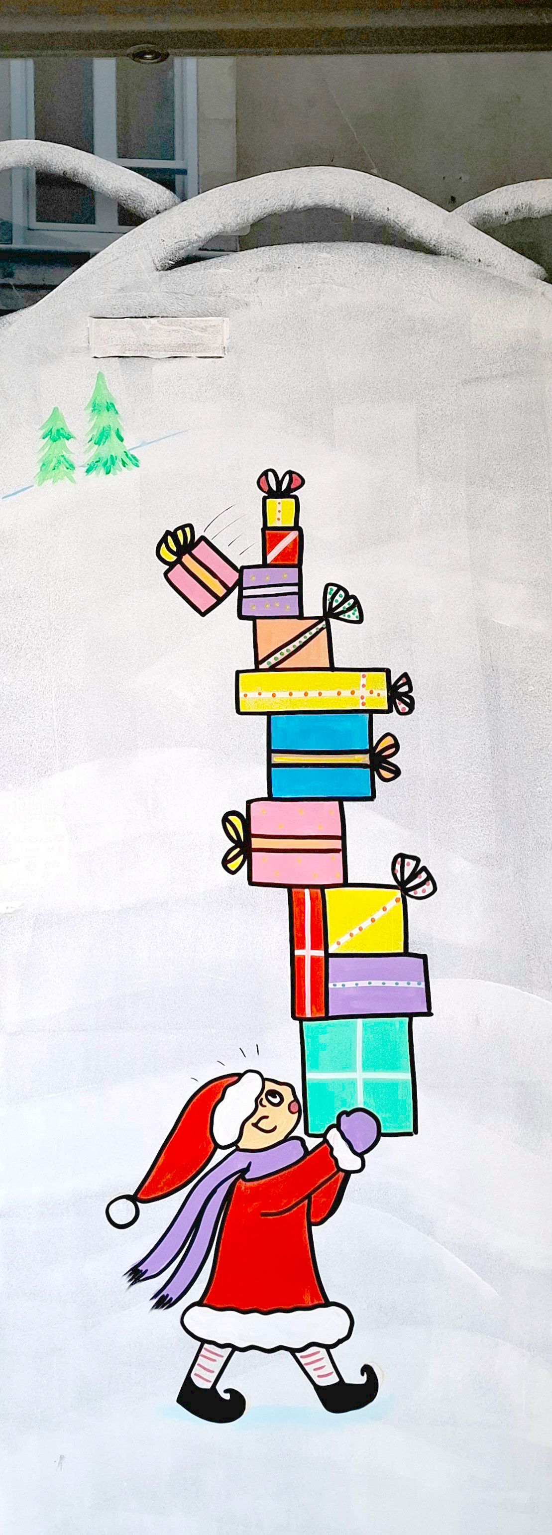 Pour rendre l’expérience encore plus ludique, j’ai intégré un jeu sur les panneaux de bois dessinés : les passants sont invités à trouver certains éléments cachés dans la fresque, interagissant ainsi avec les lutins et rennes de la vitrine.