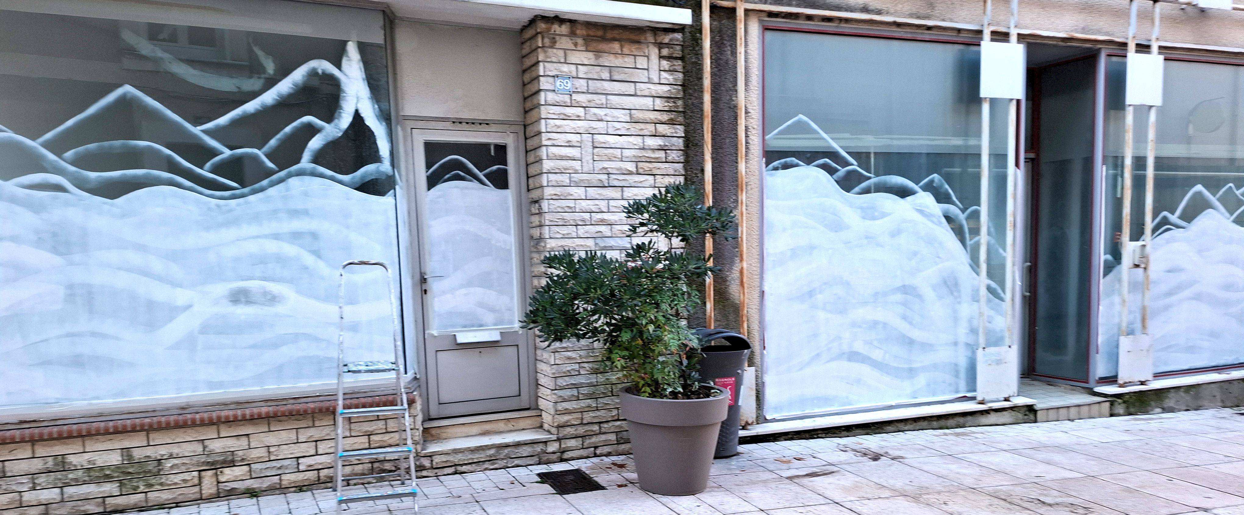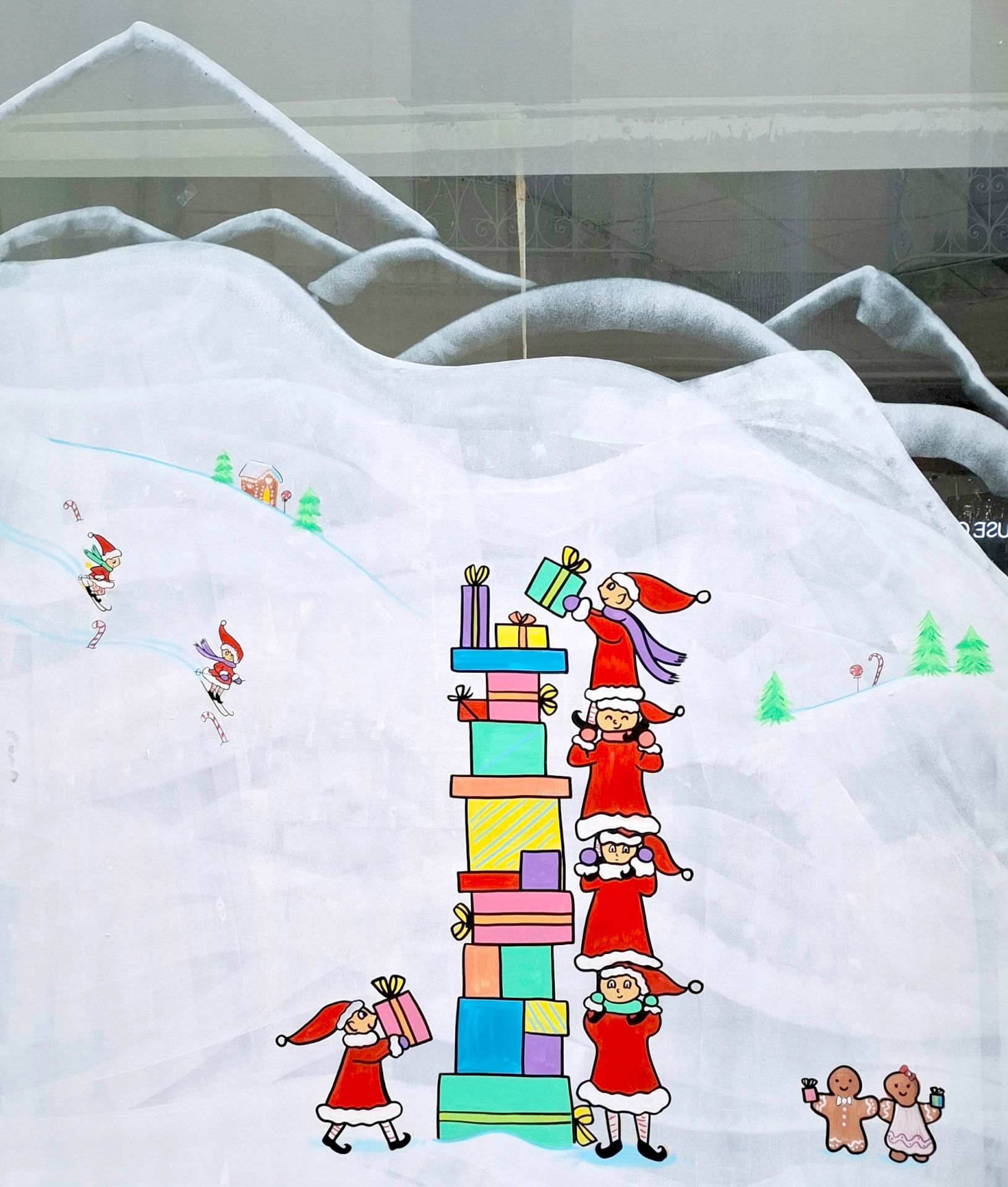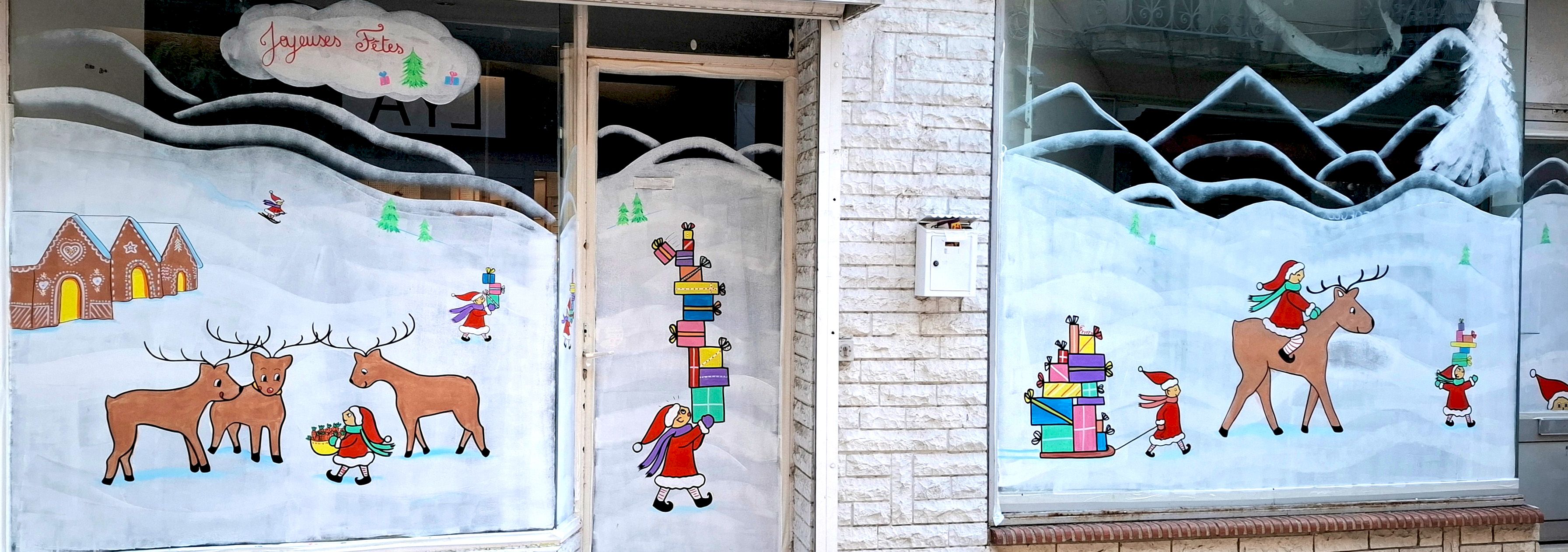 Cette année, j’ai eu le plaisir de réaliser une grande fresque de Noël sur quelques vitrines de la rue de la république à Bagnols-sur-Cèze, transformant le bas de la rue en village magique des lutins. Une illustration pleine de détails et de poésie, qui invite les passants à s’émerveiller et à jouer avec les personnages.