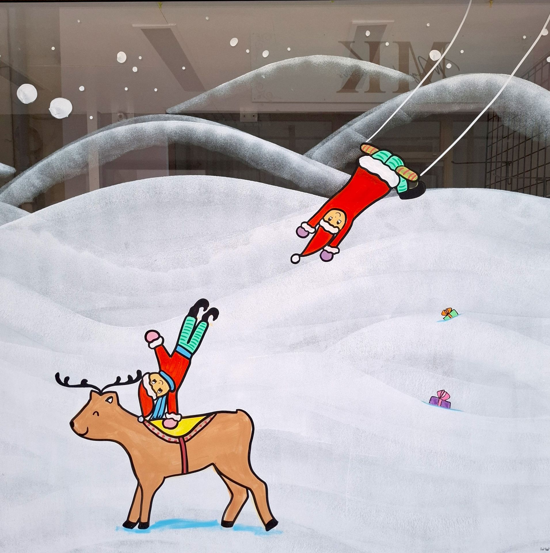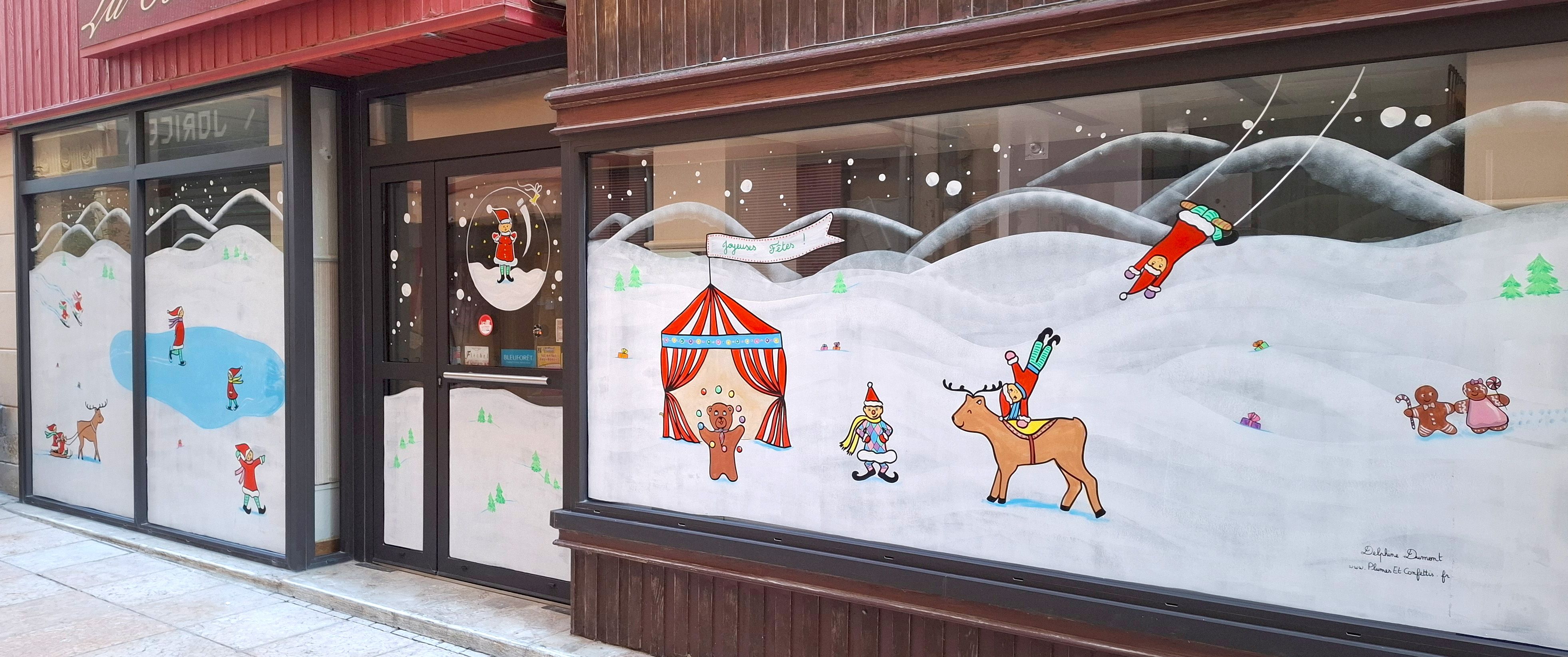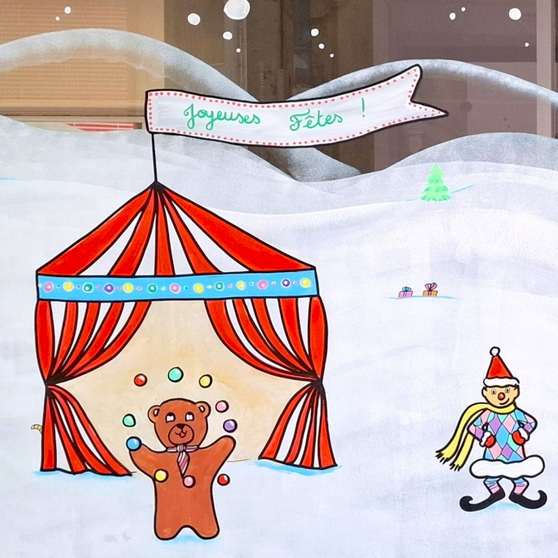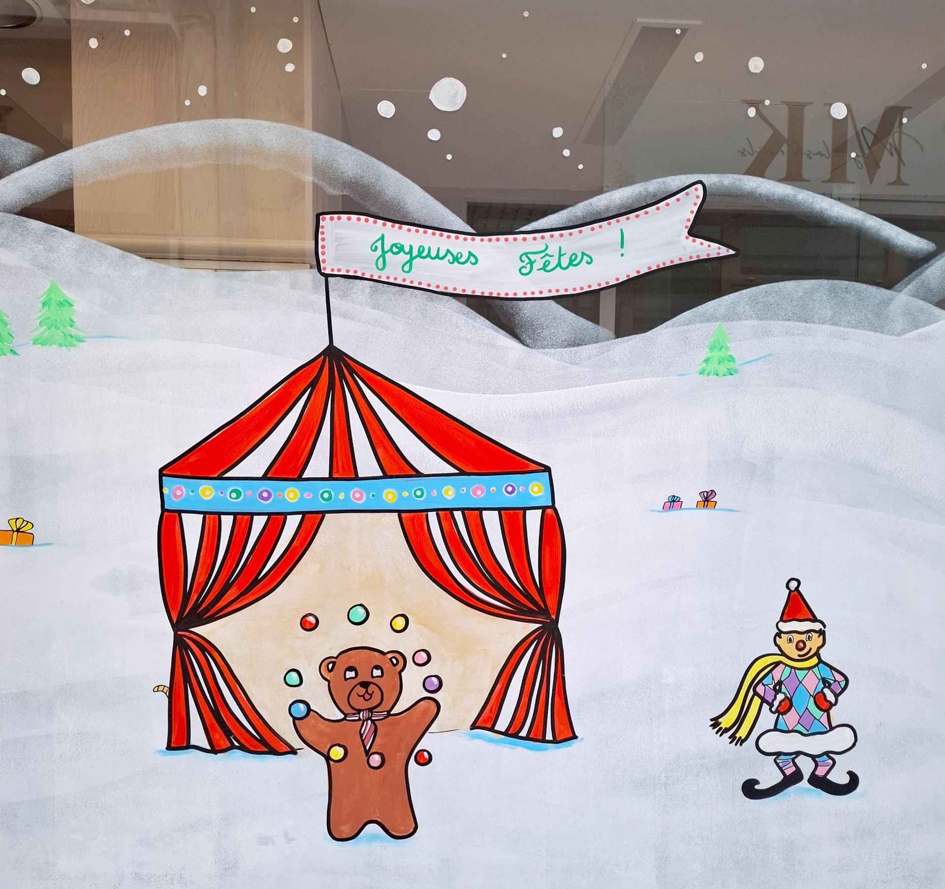 Un cirque enchanté : fresque de Noël sur vitrine dans la rue de la République à Bagnols-sur-Cèze