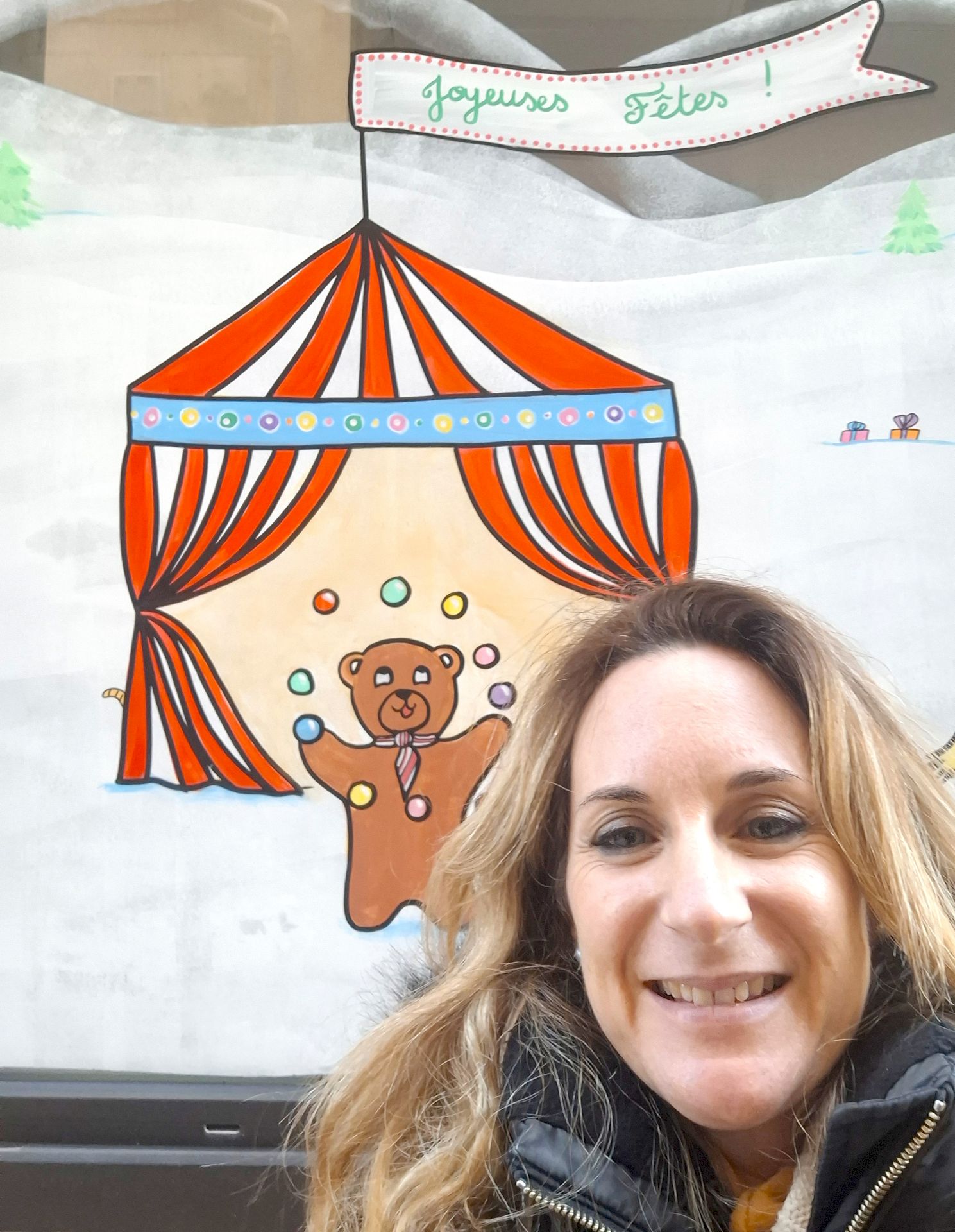 Cette année, j’ai eu la joie de réaliser une peinture sur vitrine de Noël dans le haut de la rue de la République à Bagnols-sur-Cèze, une grande fresque pour faire rêver petits et grands. Entre la magie d’un cirque enneigé et la douceur des jeux d’hiver, cette illustration raconte une histoire que je vais vous raconter.