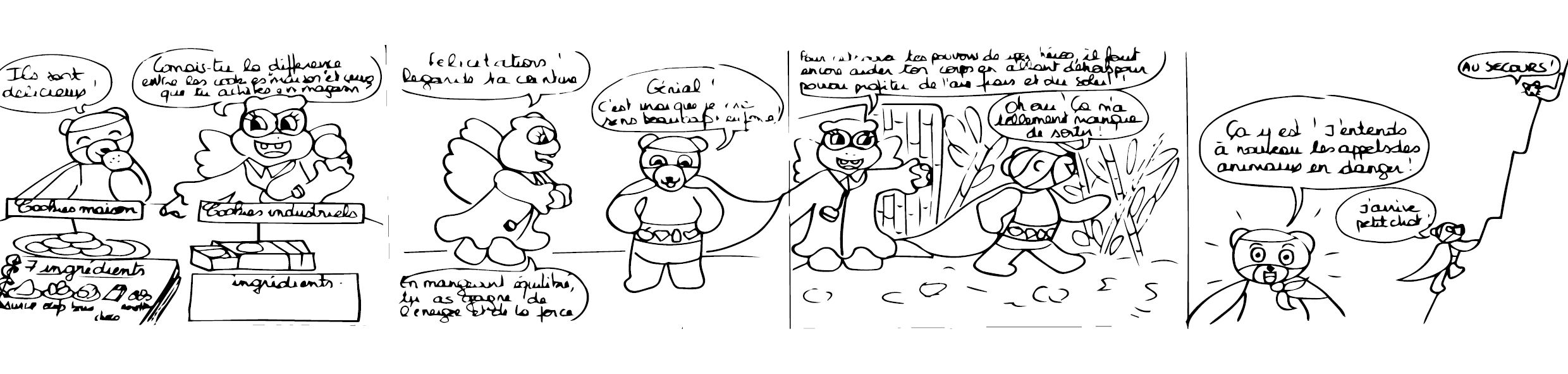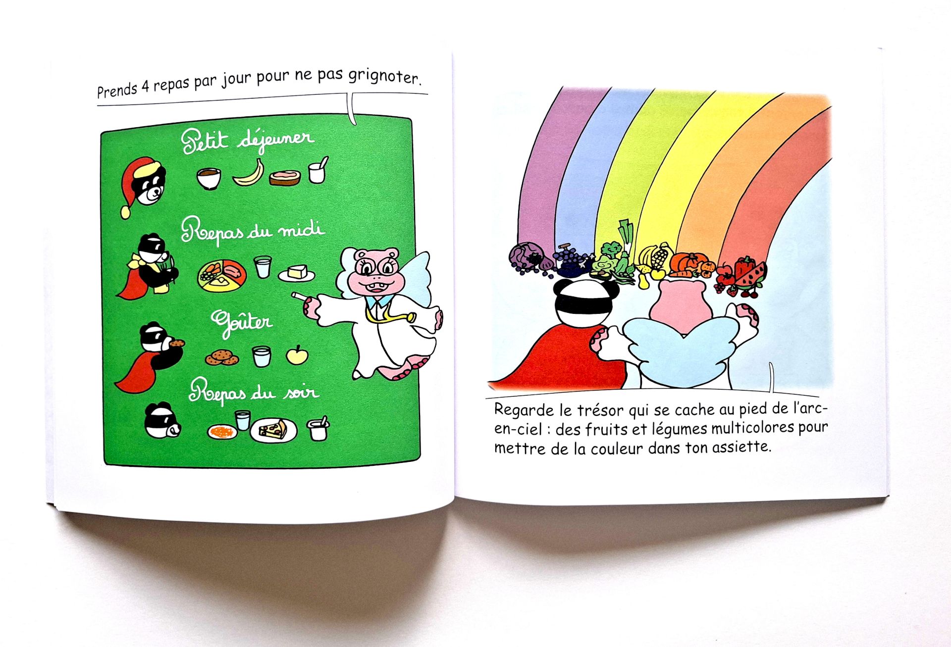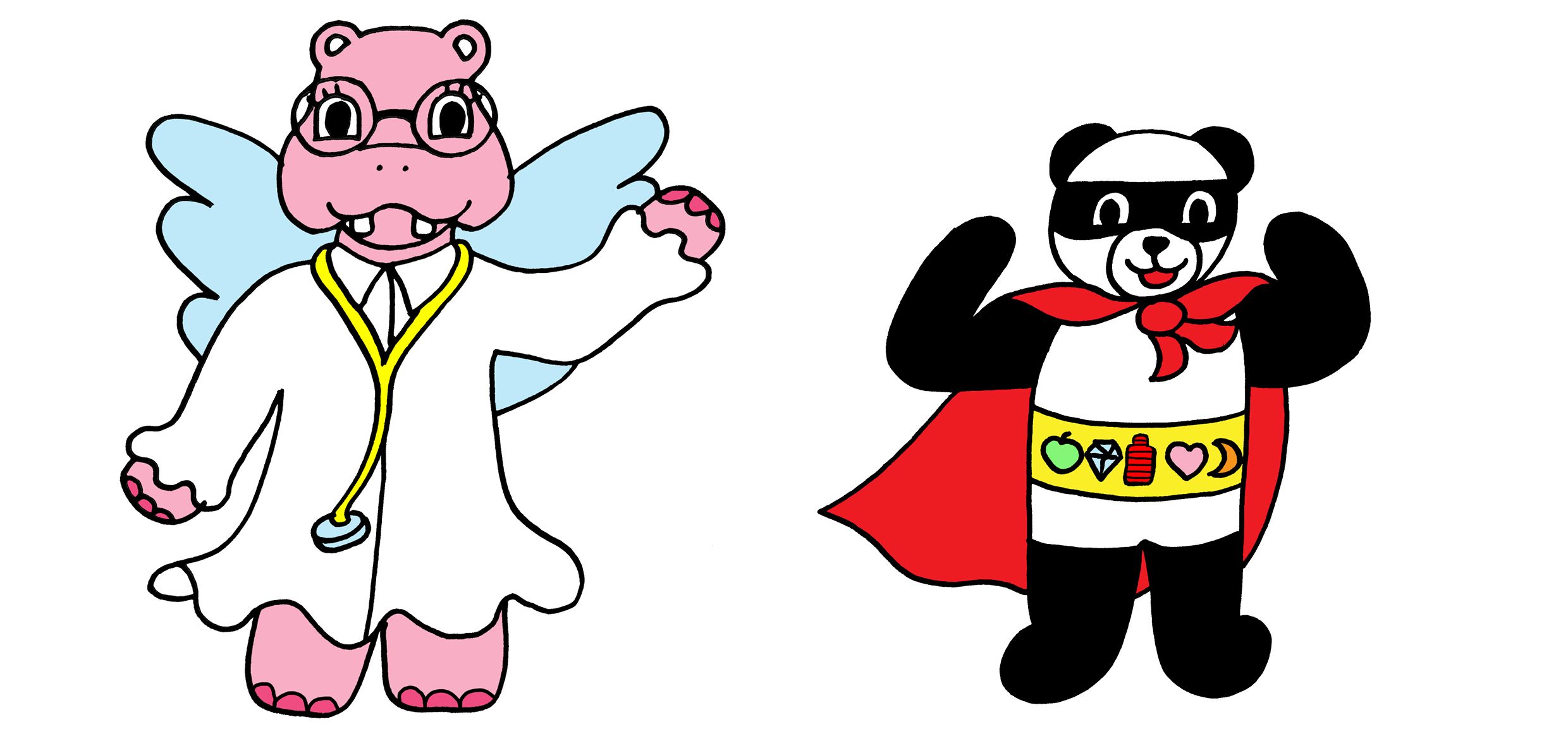 Je crée des personnages attachants auxquels les enfants vont pourvoir s’identifier. C’est comme ça que Super Panda (le personnage principal) et Docteur Hippo (la docteur des super-héros) sont nés. Bon, j’avais pour consigne de créer un docteur hippopotame avec des ailes, j’adore !